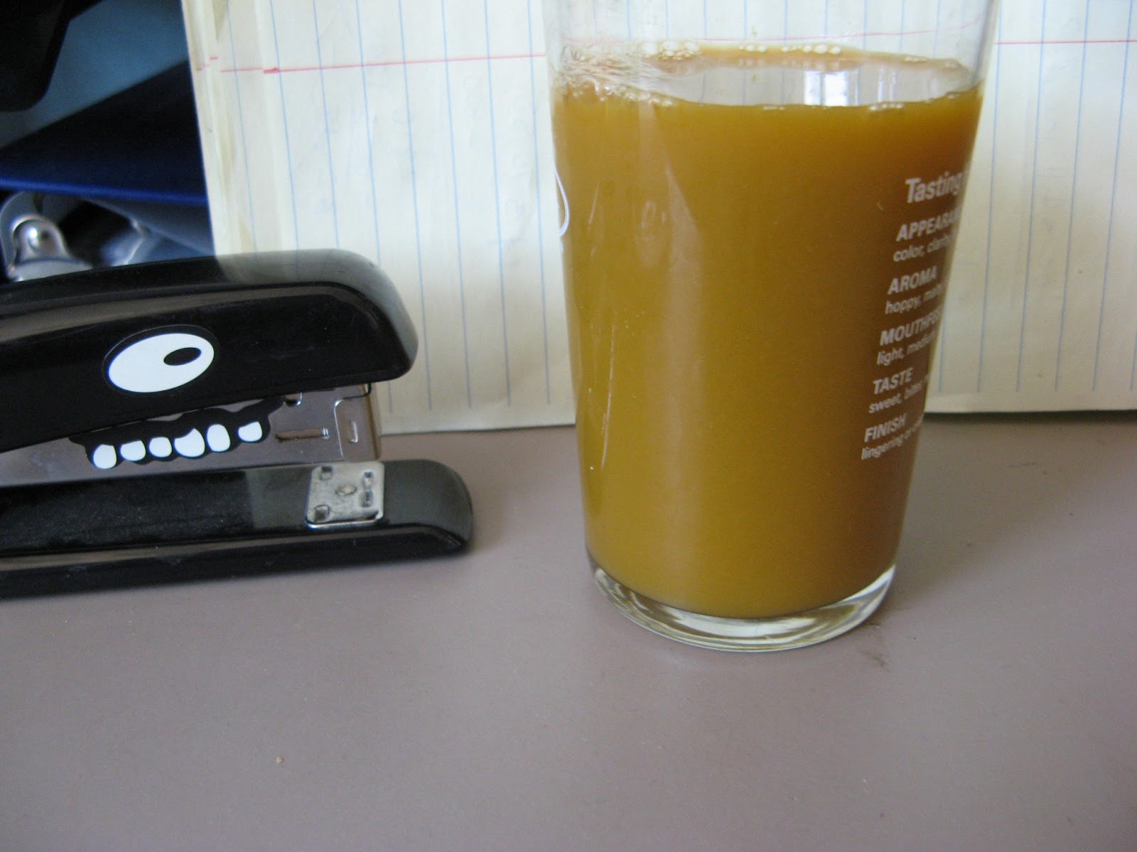 #1 Carrot-orange-ginger-kale (1 carrot, 2 oranges, sliver of ginger, 2 kale leave/stems) : I took it with me on a five mile hike with an ice pack. For some reason got really bitter. Sometimes my fresh squeezed OJ gets bitter if left alone for a few hours. Maybe it was the ginger. Not my favorite b/c of the bitter. Made enough for one serving.